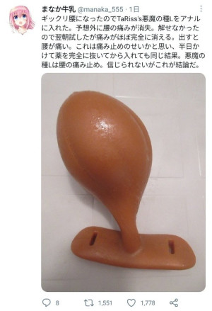 『ギックリ腰になったのでTaRiss's悪魔の種Lをアナルに入れた。予想外に腰の痛みが消失。解せなかったので翌朝試したが痛みがほぼ完全に消える。出すと腰が痛い。これは痛み止めのせいかと思い、半日かけて薬を完全に抜いてから入れても同じ結果。悪魔の種Lは腰の痛み止め。信じられないがこれが結論だ。』